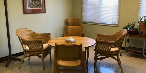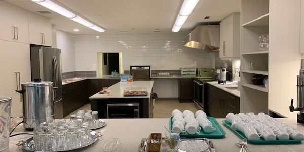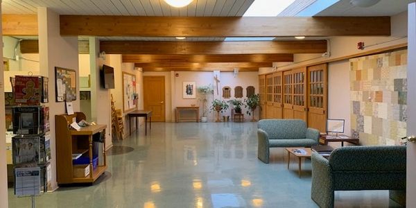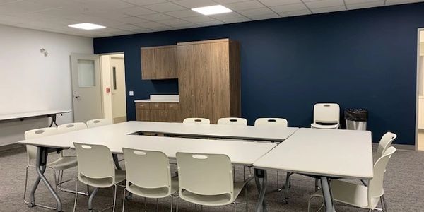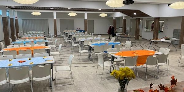 Capacity 50 people; chairs and foldable tables available, wall-mounted 22’x38′ LG screen, lots of natural light, adjacent to the sanctuary