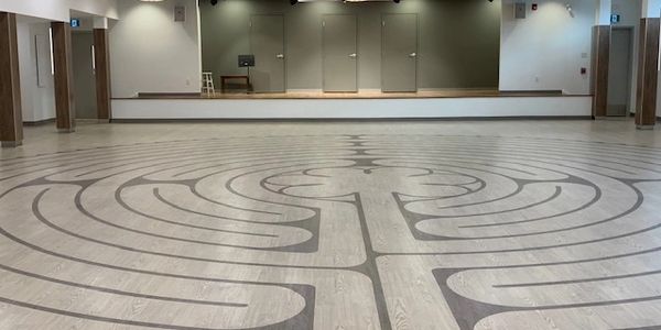 Capacity 130 people; 30 tables (table size: 72″x30″x 29″H), 106 stacking chairs, piano, audio-visual system, large projection screen, hearing loop, raised stage (23′ wide, 10’8″ deep), floor labyrinth; beautifully renovated.